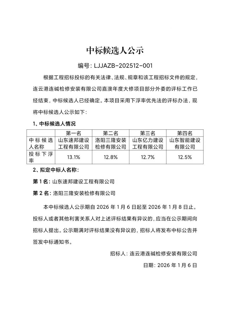 连云港连碱检修安装有限公司嘉澳年度大修项目中标候选人公示