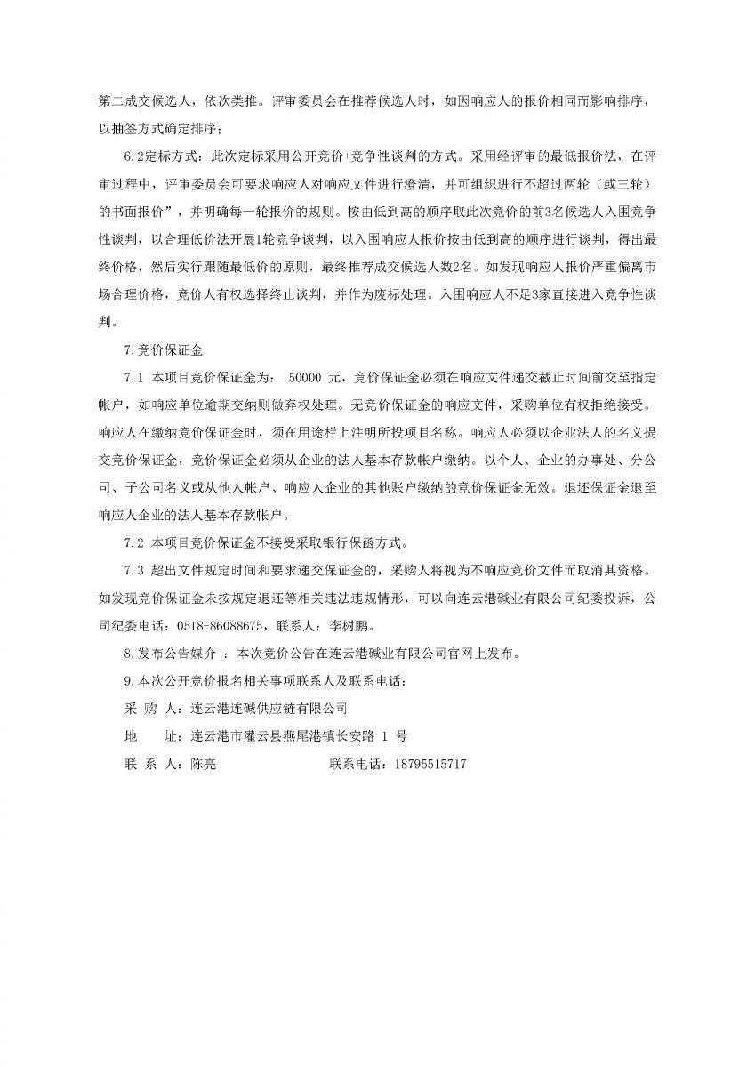 连云港连碱供应链有限公司煤炭汽车短驳运输项目公开竞价公告
