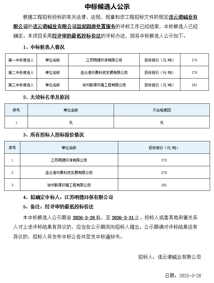 连云港碱业有限公司盐泥固废处置服务中标候选人公示