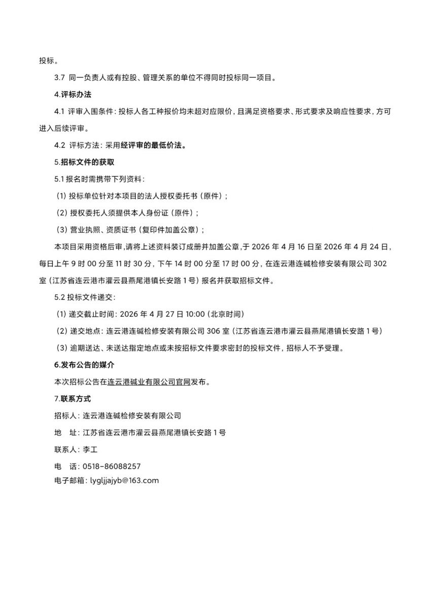连云港连碱检修安装有限公司焦化项目维保框架协议招标公告